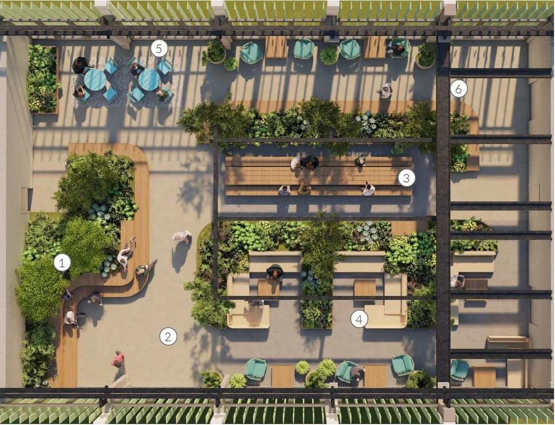 Rooftop garden – Offering amphitheatre-style seating, open event spaces, and outdoor lounges.